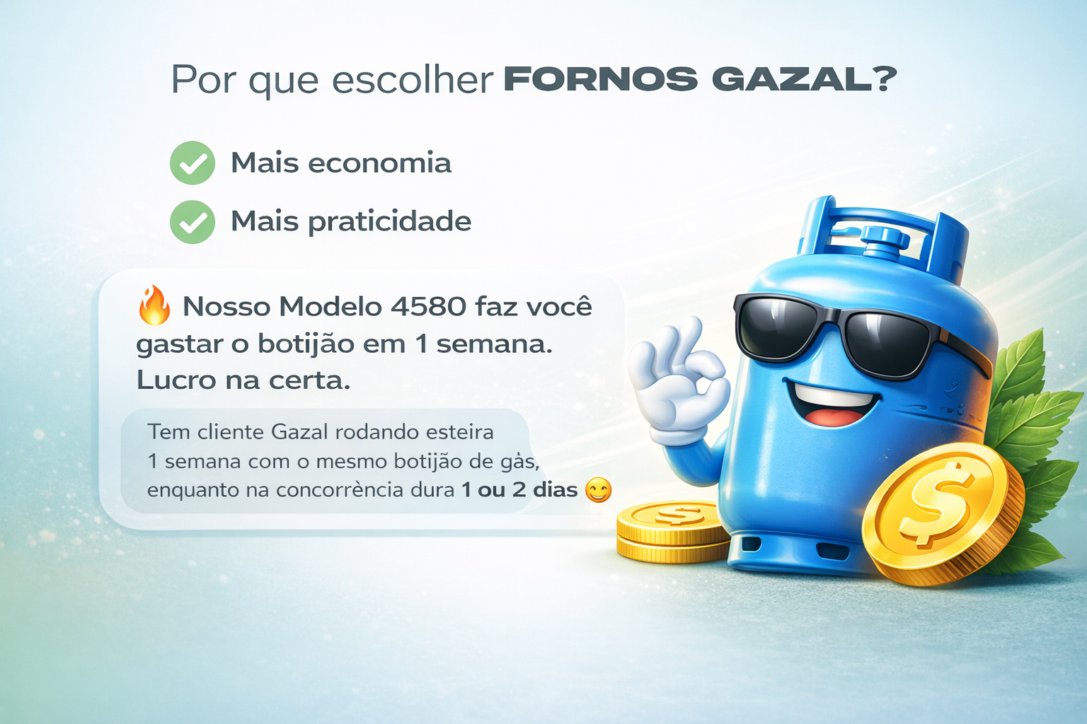 O modelo Esteira 4580 é prova disso: enquanto muitos fornos do mercado consomem um botijão em 1 ou 2 dias, clientes Gazal conseguem rodar até 1 semana inteira com o mesmo botijão — mais economia, mais lucro e mais tranquilidade.